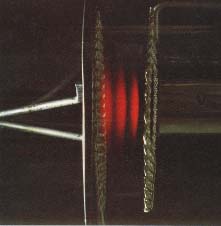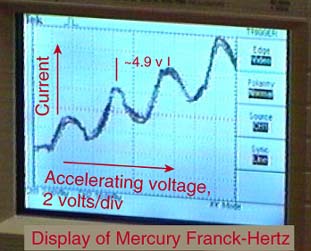 When the accelerated electrons excite the electrons in neon to upper states, they de-excite in such a way as to produce a visible glow in the gas region in which the excitation is taking place. There are about ten excited levels in the range 18.3 to 19.5 eV. They de-excite by dropping to lower states at 16.57 and 16.79 eV. This energy difference gives light in the visible range. Since the accelerated electrons undergo inelastic collisions with the neon and are then accelerated again, they can undergo a series of such collisions if the accelerating voltage is high enough. Since the accelerating voltage from the Franck-Hertz console can reach about 80 volts, you can get up to four collisions. This can be seen under proper conditions as four bands of light from the de-excitation in the collison regions. |