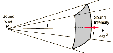 Inverse Square Law, SoundThe sound intensity from a point source of sound will obey the inverse square law if there are no reflections or reverberation. A plot of this intensity drop shows that it drops off rapidly. ![]()