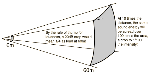 In an open area, sound drops off according to the inverse square law. In an auditorium where the front seats are 6 meters (20 ft) from the sound source and the back seats are 60 m (200 ft) from the sound source, the sound intensity would drop by a factor of 100 ( = 20 decibels )