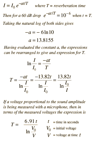 Reverberation Time EstimateOne way to estimate the reverberation time of a room is to make a plot of the decay pattern from a sharp sound and approximate it with an exponential. The standard reverberation time is the time to drop 60 decibels, or to one-millionth or 10-6 of the original level. If that time can be projected from the exponential decay, we have an estimate of the reverberation time of the room. ![]() The last step makes use of the fact that the sound intensity is proportional to the square of the amplitude of the wave, and that most microphones produce an output voltage which is proportional to the amplitude of the pressure wave. ![]() Above is an example of data from a handclap. There are lots of "real world" problems with this approach, and the only thing that can really be claimed is that it gives a real impression of the nature of sound decay in a room. The decay envelope is not symmetric about the horizontal axis, it is not a smooth decay, etc. The equipment used was just a microphone connected to a laptop computer and the software MacScope II from Elisha Huggins which gave an oscilloscope-type display of the microphone output as a function of time.