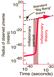 Lemonick and Nash in a popular article for Time describe inflation as an "amendment to the original Big Bang" as follows: "when the universe was less than a billionth of a billionth of a billionth of a second old, it briefly went through a period of superchanged expansion, ballooning from the size of a proton to the size of a grapegruit (and thus expanding at many, many times the speed of light). Then the expansion slowed to a much more stately pace. Improbable as the theory sounds, it has held up in every observation astronomers have managed to make."
