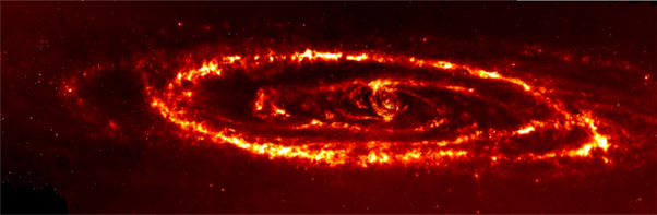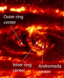 A very different view of the Andromeda Galaxy is this infrared view taken by NASA's Spitzer Space Telescope . It revealed a never-before-seen dust ring deep within the Andromeda galaxy. Combined with previous data about an outer ring, it was interpreted as evidence that the neighboring dwarf galaxy M32 collided with the Andromeda Galaxy about 210 million years ago, plunging through its central disc. |