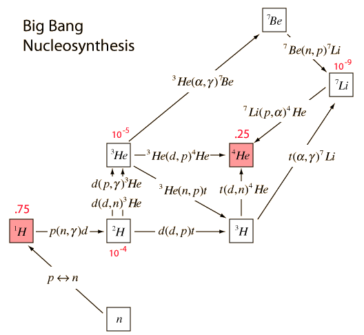Big Bang Nucleosynthesis![]() The modeling of the early universe by the standard big bang model gives a scenario that involves twelve nuclear interactions that led to the present cosmic abundances of elements outside the stars. The vast majority of the mass of ordinary matter in the universe is hydrogen and helium, remaining from the early stages of the universe. The illustration above gives nominal abundances of the current constituents. These abundances are model dependent and subject to revision. Beryllium-7 is an isotope that is produced in this process, but is not a part of the cosmic abundances because it is radioactive with half-life 53.28 days, decaying to 7Li. Neutrons are not part of the background elements because free neutrons decay with half-life 10.3 minutes. The other constituent of the reactions is tritium, 3H, which has a half-life of 12.32 years.
