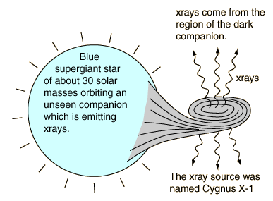 Cygnus X-1Doppler studies of this blue supergiant in Cygnus indicate a period of 5.6 days in orbit around an unseen companion. The B-type blue supergiant (HDE226868) is projected to have a mass of about 25 solar masses. The mass of the companion is calculated to be 8-10 solar masses, much too large to be a neutron star. ![]() 1. An x-ray source was discovered in the constellation Cygnus in 1972 (Cygnus X-1). X-ray sources are candidates for black holes because matter streaming into black holes will be ionized and greatly accelerated, producing x-rays. 2. A blue supergiant star, about 25 times the mass of the sun, was found which is apparently orbiting about the x-ray source. So something massive but non-luminous is there (neutron star or black hole). 3. Doppler studies of the blue supergiant indicate a revolution period of 5.6 days about the dark object. Using the period plus spectral measurements of the visible companion's orbital speed leads to a calculated system mass of about 35 solar masses. The calculated mass of the dark object is 8-10 solar masses; much too massive to be a neutron star which has a limit of about 3 solar masses - hence black hole. This is of course not a proof of a black hole -- but it convinces most astronomers. Further evidence that strengthens the case for the unseen object being a black hole is the emission of X-rays from its location, an indication of temperatures in the millions of Kelvins. This X-ray source exhibits rapid variations, with time scales on the order of a millisecond. This suggests a source not larger than a light-millisecond or 300 km, so it is very compact. The only possibilities that we know that would place that much matter in such a small volume are black holes and neutron stars, and the consensus is that neutron stars can't be more massive than about 3 solar masses. |