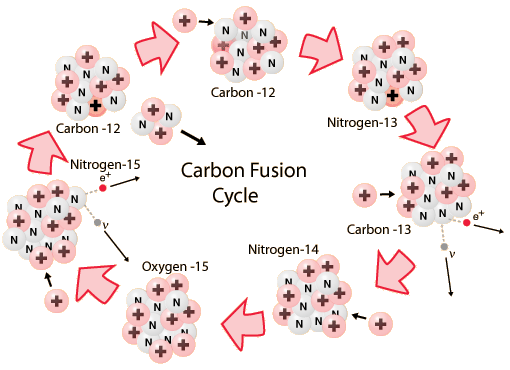 ![]() In stars with central temperatures greater than 15 million Kelvin, carbon fusion is thought to take over the dominant role rather than hydrogen fusion. The main theme of the carbon cycle is the adding of protons, but after a carbon-12 nucleus fuses with a proton to form nitrogen-13, one of the protons decays with the emission of a positron and a neutrino to form carbon -13. Two more proton captures produce nitrogen-14 and then oxygen-15. Another neutron decay leaves nitrogen-15. Another proton capture produces oxygen-16 which emits an energetic alpha particle to return to carbon-12 to repeat the cycle. This last reaction is the main source of energy in the cycle for the fueling of the star. While this process is not a significant part of the sun's fuel cycle, a star like Sirius with somewhat more than twice the mass of the sun derives almost all of its power from the carbon cycle. The carbon cycle yields 26.72 MeV per helium nucleus.