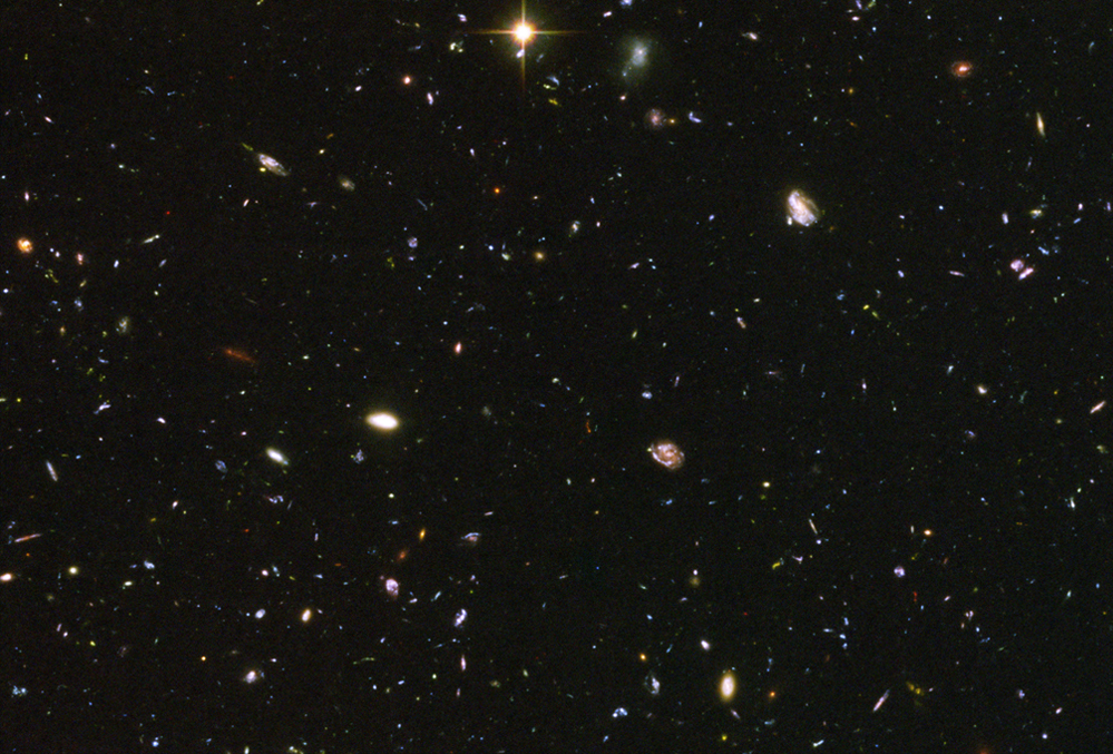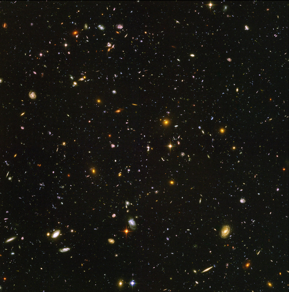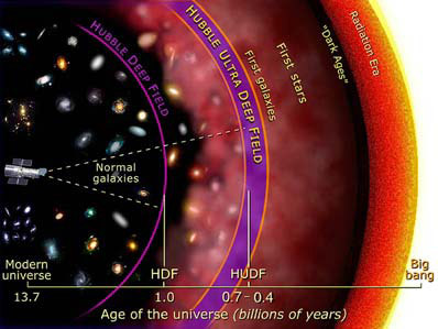 The above NASA illustration depicts the range of view of some of the galaxies of the ultradeep field as beingin the range of 400 to 700 million years after the big bang, some of the most distant objects ever viewed. The NASA illustration at right shows the location of the view.