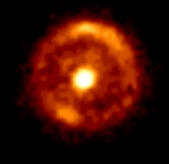 (U. Manchester, NICMOS, HST, NASA). The formal designation of the more distant galaxy is B1938+666. The ring is described as being 1 arcsecond across as observed from Earth's vicinity, but tens of thousands of light years across in size. The foreground galaxy must be almost perfectly aligned to provide a circular ring of light like this example.