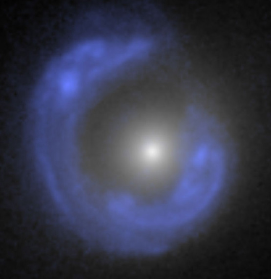 The background galaxy identified as SDSSJ1430 forms an Einstein ring "mirage" around the foreground normal white galaxy. This image is credited to A.Bolton (UH/IfA) for SLACS and NASA/ESA.