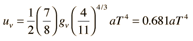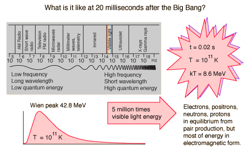 Energy in Radiation in the Early Universe![]() Electromagnetic radiation and the flux of neutrinos were the dominant form of energy in the early universe, becoming more dominant as one models earlier times in the big bang. It is reminiscent of the Biblical phrase "Let there be light". But of course this is not visible light but far beyond gamma rays since the average photon energy increases as one models earlier times and photon energies become high enough to accomplish pair production of all known particles. For example at a temperature of 1011 K, modeled at a time of about 20 milliseconds into Weinberg's model of the big bang, the thermal energy kT = 8.6 MeV. At this temperature, the peak energy given by the Wien displacement law is 42.8 MeV. The radiation energy was sufficient not only for electron-positron pair production, but also to maintain essentially equal populations of protons and neutrons. So in that era, radiation was truly dominant. The radiation energy density in astronomy texts is usually put in the form ![]() ![]() For consistency with other particle quantities that are expressed in terms of the number of degrees of freedom, this is sometimes written in the form ![]() To assess the role of radiation in the expansion of the early universe, one must take a step beyond the simple Newtonian expansion model and include the radiation pressure. When the radiation pressure is included, the effective density represented by the radiation as a function of the scale factor R is ![]() The dependence on the fourth power of R distinguishes the radiation energy density from the mass density, which depends upon the third power of R, ![]()