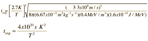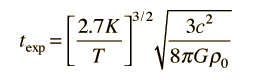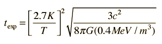 Temperature and Expansion Time in the Standard Big Bang ModelIn the big bang model of the expansion of the universe, the expansion time can be expressed in terms of the Hubble parameter ,and the Hubble parameter can be related to a model of expansion with the use of the Friedmann equation. .For early stages of the expansion of the universe, it's energy density was dominated by radiation, with matter present only as a negligible contaminant. Under those conditions, the density in the Friedmann equation can be taken as that associated with the radiation field and related to the ratio of the temperature at a given time and the current temperature of the cosmic background radiation. This gives .The dependence on the fourth power of the temperature comes from the Stefan- Boltzmann law. Substituting into the Friedmann equation gives an expression of the expansion time as a function of temperature in the radiation-dominated early universe. .The energy densities of radiation and matter are about equal at the temperature of the transparency point, about 3000 K. At much lower temperatures, the energy is dominated by matter. The energy density of the matter as a function of temperature is given by .The resulting expression for expansion time from the Friedmann equation is then .