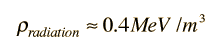 Division of Energy Between Photons and Massive ParticlesOne of the ideas associated with modeling the Big Bang is that the further back in time you project, the more the universe is dominated by photons. We think of today's universe as mostly matter, but the energy of the early universe was mostly photon energy with massive particles playing a very small role. The amount of energy in radiation in today's universe can be estimated with the use of the Stefan- Boltzmann law, considering that the universe is filled with blackbody radiation at a temperature of 2.7 K. The energy density in this equilibrium radiation is given by ![]() There is also a background energy in neutrinos which is expected to have a temperature of about 1.9 K, and there are 7/4 as many of them as photons according to the standard model. Treating them as massless particles would give an energy density of about 0.11 MeV/m3, so the total energy density in photons and neutrinos is about