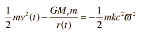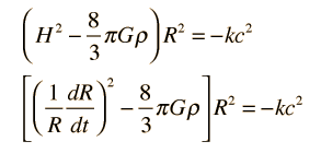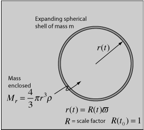 The mechanical energy can be expressed as follows, using the notation of Carroll and Ostlie: ![]() The term on the right is an expression for the total energy of the shell which has been constructed in a form to be of future usefulness. In that expression, c is the speed of light, m is the mass, k is a constant which will be used to represent the "curvature" of the space system, and ϖ is a coordinate whose value represents the chosen mass shell and will remain constant as a "comoving coordinate" to specify that shell. The radius r(t) can then be expressed in terms of a time-dependent scale factor R(t) which specifies the expansion of the space and this comoving coordinate: ![]() Now making use of the Hubble law, we can express the velocity of the expanding shell as ![]() Since the velocity can also be expressed as ![]() ![]() Now these terms may be substituted into the energy expression above such that every term is a multiple of the comoving parameter ϖ which may then be canceled out. This suggests that the resulting equations apply to any shell and constitute a description of the expanding space in terms of the expansion factor R(t) and the Hubble parameter H(t). The expansion equation can be put in the two equivalent forms ![]()