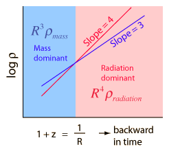This leads to dominance of radiation in the very early universe but a transition to a matter dominated universe at a later time. The sketch of the logarithm of the density vs the expansion z parameter at left above illustrates the transition.