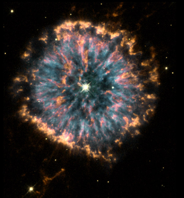 Glowing Eye Nebula![]() "Astronomers using NASA's Hubble Space Telescope have obtained images of the strikingly unusual planetary nebula, NGC 6751. Glowing in the constellation Aquila like a giant eye, the nebula is a cloud of gas ejected several thousand years ago from the hot star visible in its center. The Hubble observations were obtained in 1998 with the Wide Field and Planetary Camera 2 (WFPC2) by a team of astronomers led by Arsen Hajian of the U.S. Naval Observatory in Washington, DC. The Hubble Heritage team, working at the Space Telescope Science Institute in Baltimore, has prepared this color rendition by combining the Hajian team's WFPC2 images taken through three different color filters that isolate nebular gases of different temperatures. The nebula shows several remarkable and poorly understood features. Blue regions mark the hottest glowing gas, which forms a roughly circular ring around the central stellar remnant. Orange and red show the locations of cooler gas. The cool gas tends to lie in long streamers pointing away from the central star, and in a surrounding, tattered-looking ring at the outer edge of the nebula. The origin of these cooler clouds within the nebula is still uncertain, but the streamers are clear evidence that their shapes are affected by radiation and stellar winds from the hot star at the center. " (NASA description). Photo credit: NASA.