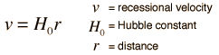 Hubble's LawHubble's law is a statement of a direct correlation between the distance to a galaxy and its recessional velocity as determined by the red shift. It can be stated as ![]() ![]() The Particle Data Group documents quote a "best modern value" of the Hubble parameter as 72 km/s per megaparsec (+/- 10%). This value comes from the use of type Ia supernovae (which give relative distances to about 5%) along with data from Cepheid variables gathered by the Hubble Space Telescope. The WMAP mission data leads to a Hubble constant of 71 +/- 5% km/s per megaparsec.