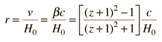 Hubble ParameterThe proportionality between recession velocity and distance in the Hubble Law is called the Hubble constant, or more appropriately the Hubble parameter since it does depend upon time. In recent years the value of the Hubble parameter has been considerably refined, and the current value given by the WMAP mission is 71 km/s per megaparsec. The recession velocities of distant galaxies are known from the red shift, but the distances are much more uncertain. Distance measurement to nearby galaxies uses Cepheid variables as the main standard candle, but more distant galaxies must be examined to determine the Hubble constant since the direct Cepheid distances are all within the range of the gravitational pull of the local cluster. Use of the Hubble Space Telescope has permitted the detection of Cepheid variables in the Virgo cluster which have contributed to refinement of the distance scale. The Particle Data Group documents quote a "best modern value" of the Hubble constant as 72 km/s per megaparsec (+/- 10%). This value comes from the use of type Ia supernovae (which give relative distances to about 5%) along with data from Cepheid variables gathered by the Hubble Space Telescope. The value from the WMAP survey is 71 km/s per megaparsec. Another approach to the Hubble parameter gives emphasis to the fact that space itself is expanding, and at any given time can be described by a dimensionless scale factor R(t). The Hubble parameter is the ratio of the rate of change of the scale factor to the current value of the scale factor R: ![]() The scale factor R for a given observed object in the expanding universe relative to R0 = 1 at the present time may be implied from the z parameter expression of the redshift. The Hubble parameter has the dimensions of inverse time, so a Hubble time tH may be obtained by inverting the present value of the Hubble parameter. ![]() One must use caution in interpreting this "Hubble time" since the relationship of the expansion time to the Hubble time is different for the radiation dominated era and the mass dominated era. Projections of the expansion time may be made from the expansion models.