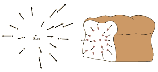 Expanding UniverseThe galaxies we see in all directions are moving away from the Earth, as evidenced by their red shifts. Hubble's law describes this expansion. ![]() The fact that we see all other galaxies moving away from us does not imply that we are the center of the universe! All galaxies will see all other stars moving away from them in an expanding universe. A rising loaf of raisin bread is a good visual model: each raisin will see all other raisins moving away from it as the loaf expands. The fact that the universe is expanding then raises the question "Will it always expand?" Since the action of gravity works against the expansion, then if the density were large enough, the expansion would stop and the universe would collapse in a "big crunch". This is called a closed universe. If the density were small enough, the expansion would continue forever (an open universe). At a certain precise critical density, the universe would asymtotically approach zero expansion rate, but never collapse. Remarkably, all evidence indicates that the universe is very close to that critical density. Discussions about the expansion of the universe often refer to a density parameter Ω which is the density divided by the critical density, such that Ω = 1 represents the critical density condition.
