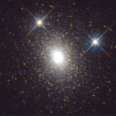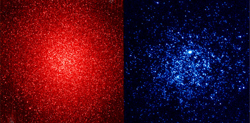 Star ClustersWithin our Milky Way galaxy are recognizable clusters of stars. Containing from dozens to millions of stars in a region a few parsecs across, they have been useful for stellar studies. Presumed to have formed about the same time because of their association, they serve as laboratories for the study of star formation and evolution. A familiar example of what is called an "open cluster" is the Pleiades, or Seven Sisters which can be seen with the naked eye. When a Hertzprung-Russell diagram (H-R diagram) is done for this cluster, stars of all colors (spectral classes) are seen. This implies that the cluster is relatively young, since the O and B type stars are short-lived. An age of 25 million years or less is estimated. Containing about 3000 stars, the Pleiades cluster is about 120 pc from the Sun and spans about 4 pc. A very different story is told by Omega Centauri, a dense globular cluster of stars. Omega Centauri is the largest known globular cluster in our galaxy. It is a very dense collection of stars about 5000 pc from the Sun and spans about 40 pc. Globular clusters are roughly spherical and can contain hundreds of thousands to millions of stars. The population of Omega Centauri is estimated to be about 10 million. The H-R diagram of Omega Centauri reveals an absence of O and B type stars, the hot blue stars that have short lifetimes. This tells us that such clusters are composed of old stars. Globular clusters consist of red and yellow (low and intermediate mass) stars less than about 0.8 solar masses. ![]() These are images of the Omega Centauri cluster credited to NASA and UIT. The left image is in the visible while the right image is an ultraviolet image taken by the Ultraviolet Imaging Telescope. Most of the stars are in the red range, as explained above, but some stars are in later stages of their evolution that cause them to exhibit higher temperatures for a relatively brief period on their way to their final white dwarf stages. Omega Centauri can be seen with the unaided eye, and was included in an early star catalog as a star. It is one of about 150 known globular clusters in the Milky Way.
