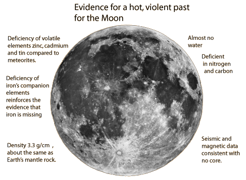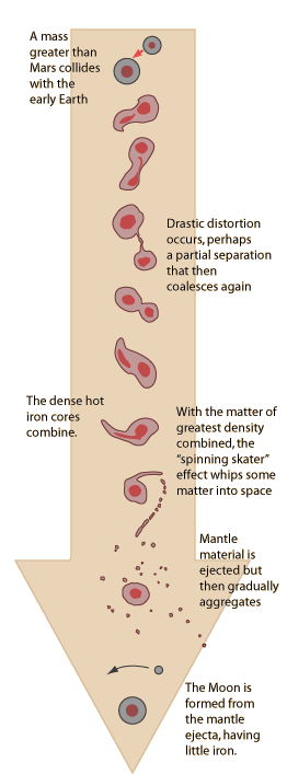 Development of Lunar Origin HypothesesBefore the landing of Apollo 11 on the Moon in 1969, the most popular theory was the the Moon had formed cold and could be a Rosetta Stone for studying the origin of the solar system. The sheer volume of data and samples returned by the Apollo program occupied planetary scientists for over a decade. At a critical meeting on the origin of the Moon held in Kona, Hawaii in 1984 a new picture began to emerge, one involving a massive impact early in the history of the Earth. A collection of papers from that meeting was published in a 1986 book edited by Hartmann, Phillips and Taylor who had been working on the impact hypothesis for some years. Hartmann had worked with Donald R. Davis on earlier models of this hypothesis. Cameron and Canup also worked on the impact hypothesis and did computer simulations of the process. Such modeling was the subject of Dr. Robin Canup's Ph.D. dissertation in the 1990's on the moon's origin and the giant impact hypothesis. Some web references:http://www.psi.edu/projects/moon/moon.html http://www.xtec.es/recursos/astronom/moon/camerone.htm http://www.space.com/scienceastronomy/solarsystem/moon_making_010815-1.html |