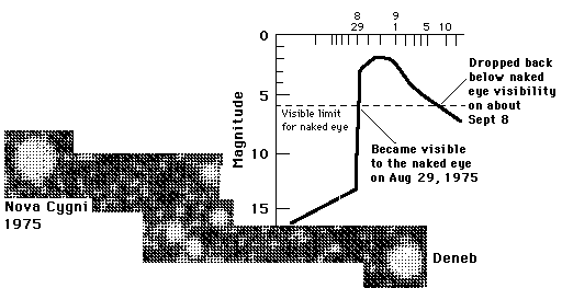 Nova Cygni 1975The brightest Nova in recent years was Nova Cygni 1975 which became visible in Cygnus in August. It reached a magnitude of 1.8 after a rise in magnitude of about 15 in two days time. This is a million-fold increase in luminosity!![]() |