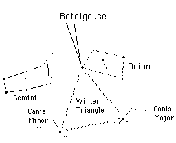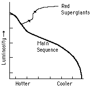 expands to an even larger volume. The much brighter, but still reddened star is called a red supergiant. Betelgeuse, at the shoulder of Orion, is the best-known example. Absolute luminosities may reach -10 magnitude compared to +5 for our sun.