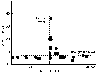 Supernova 1987A NeutrinosTen neutrino events were detected in a deep mine neutrino detection facility in Japan which coincided with the observation of Supernova 1987A. They were detected within a time interval of about 15 seconds against a background of lower energy neutrino events. A similar facility, IMB in Ohio detected 8 neutrino events in 6 seconds. These observations were made 18 hours before the first optical sighting of the supernova. ![]()