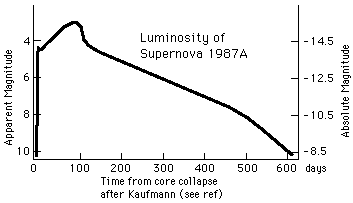 Supernova 1987AThe discovery of Supernova 1987A was a great opportunity for detailed observation of the dynamics of a supernova. This supernova was unusual in that it did not rise abruptly to its maximum brightness, but paused briefly before increasing its luminosity by another factor of ten. It increased for about 85 days and then began a gradual decline which was more characteristic of other observed supernovae. Another unique feature about this supernova is that the star which exploded had been observed and named Sk-69202. It was a blue supergiant presumed to have a mass of about 20 solar masses. Almost coincident with the observation of the supernova, a burst of neutrinos were observed on the Earth, providing further information for modeling supernovae and providing another test for the mass of the neutrino. |