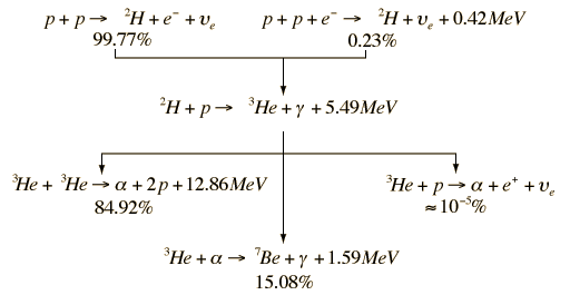 Nuclear Reactions in the p-p ChainThis is the nuclear fusion process which fuels the sun and other stars which have core temperatures less than 15 million Kelvin. A reaction cycle yields about 25 MeV of energy. The modeling of these reactions is a part of the standard solar model. ![]() Note that both reactions which produce deuterium also produce a neutrino. Measuring the energy output of the sun and comparing it to this model allows us to predict the number of neutrinos that will hit the earth. The fact that early experiments detected only about a third of that number was called the "solar neutrino problem". |
