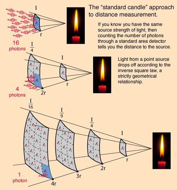 If you know the source strength, or absolute luminosity, of an astronomical object then you can calculate the distance from the observed luminosity using the inverse square law. Many methods are obtained to model the absolute luminosity of particular spectral types of stars and the nature of other objects in the universe. Particularly helpful have been the Cepheid variable stars, whose absolute luminosity is proportional to their period of variability. The Type-1a supernovae have been particularly useful since there is good reason to believe that they all have essentially the same absolute luminosity.