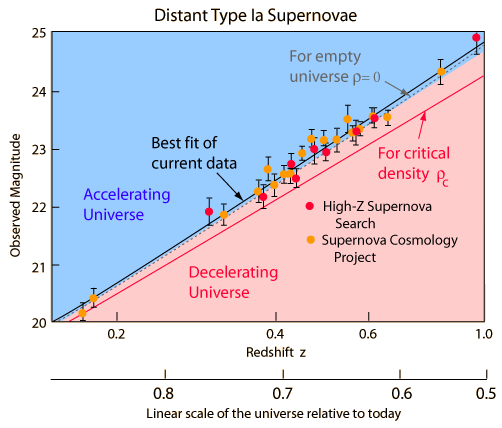 Evidence for an accelerating universeOne of the observational foundations for the big bang model of cosmology was the observed expansion of the universe. Measurement of the expansion rate is a critical part of the study, and it has been found that the expansion rate is very nearly "flat". That is, the universe is very close to the critical density, above which it would slow down and collapse inward toward a future "big crunch". One of the great challenges of astronomy and astrophysics is distance measurement over the vast distances of the universe. Since the 1990s it has become apparent that type Ia supernovae offer a unique opportunity for the consistent measurement of distance out to perhaps 1000 Mpc. Measurement at these great distances provided the first data to suggest that the expansion rate of the universe is actually accelerating. That acceleration implies an energy density that acts in opposition to gravity which would cause the expansion to accelerate. This is an energy density which we have not directly detected observationally and it has been given the name "dark energy". The type Ia supernova evidence for an accelerated universe has been discussed by Perlmutter and the diagrams below follows his illustration in Physics Today. ![]() The data summarized in the illustration above involve the measurement of the redshifts of the distant supernovae. The observed magnitudes are plotted against the redshift parameter z. Note that there are a number of Type 1a supernovae around z=.6, which with a Hubble constant of 71 km/s/mpc is a distance of about 5 billion light years.