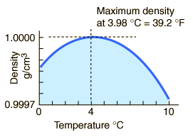 | Another remarkable fact about water is that is maximum density occurs at 4°C rather than at 0°C or below. This seemingly innocuous detail is in fact critical to life on the Earth. Water decreases in density as it approaches the freezing point. This decrease in density is only about one part in 10,000 as it cools from 4°C to 0°C, but this is sufficient to cause the water near freezing to come to the top. The water further expands upon freezing, so that water freezes from the top down, and ice floats on water. |