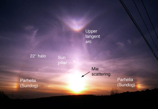 Halo PhenomenaIn addition to the 22° halo and the sun dogs, a wide variety of other arcs or halo phenomena occur around the sun in cold climates as a result of ice crystals in the air. ![]() Photo by Clay S. Turner. Used by permission. This photo was taken just north of Atlanta in December 1986. While sundogs can often be seen in Atlanta, the other arc phonemena are very rare this far south. ![]() In the photo above are two arcs at the top of the 22° halo which are called upper tangent arcs. All of the halo phenomena shown are attributed to falling hexagonal ice crystals in the atmosphere. Greenler has done a considerable amount of modeling of the origin of the various types of halos and also discusses the modeling done by others. The upper tangent arc is attributed to thin pencil-like hexagonal ice crystals falling with their long axes horizontal. In most images I have seen, there is only one of these arcs, so it is not clear to me how the pair of arcs is formed. The sun pillar is attributed to reflection off the sides of falling ice crystals. The flare of light around the sun is attributable to Mie scattering off particulate matter in the atmosphere.