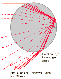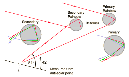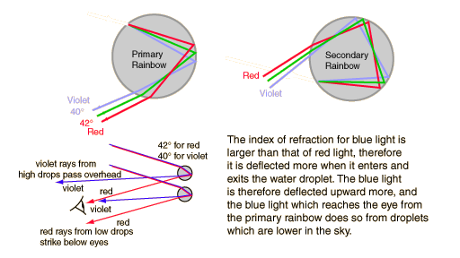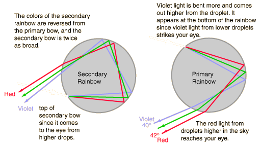 Rainbow Light PathsThe light paths associated with the primary and secondary rainbows give insight into the formation of rainbows and the order of the colors. For the primary rainbow, the light is bent by refraction upon entering a water droplet, then reflected off the back of the droplet and refracted a second time as it exits the droplet. ![]()