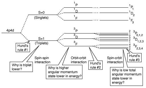 Orbit-Orbit InteractionIf two electrons in an atom spend a lot of time close to each other, then they contribute a repulsive or positive potential energy, implying that their energy level will be higher. If the electrons are orbiting in the same direction (and so have a large total angular momentum) they meet less often than when they orbit in opposite directions. Hence their repulsion is less on average when L is large. The fact that such electron configurations have lower energy means that they will be filled first, and this fact is noted in "Hund's rule #2". |