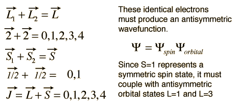 This kind of coupling is called L-S coupling or Russell-Saunders coupling, and it is found to give good agreement with the observed spectral details for many light atoms. For heavier atoms, another coupling scheme called "j-j coupling" provides better agreement with experiment. The vector model illustrated above was applied to a single electron, but a similar model can be applied when multiple electrons contribute to the net angular momentum. If identical electrons are involved, then proper care must be taken to make sure the combinations produce an antisymmetric wavefunction upon exchange of identical electrons. For example, consider the electron configuration of titanium, (Ar)3d24s2. The 4s electrons contribute to a closed shell and the 3d2 electrons contribute the net angular momentum. Under the L-S coupling conditions this gives the following. ![]() The possibility of J=5 is excluded by symmetry considerations for the identical electrons, but the other states can be visualized by the vector model. |
