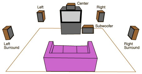 Digital Sound Processing and Home Theaters![]() With the coming of the DVD era of consumer video, digital sound processing is becoming the standard. Typical is the so-called 5.1 channel encoding, for which one of the names is "Dolby digital", crediting Dolby Laboratories with much of the development work. The implication of "5.1 channels" is that there are five discrete full sound signals plus a signal for the subwoofer which is limited to the low frequency range and is the ".1" in the "5.1". A popular alternative name for the low frequency speaker is a "LFE" or "Low Frequency Effects" channel. The Dolby web site has a considerable amount of general information about setting up home theaters. Among the bits of advice given there is that the left and right surround speakers should be alongside, slightly to the rear and above the main listening position. They should be pointed so that the sound sweeps across the main listening area from both directions. This kind of arrangement is thought to be beneficial by keeping your ear from localizing the sound as coming from these speakers - they are supposed to provide a volume sound, but only rarely should be perceived as the main source of sound.