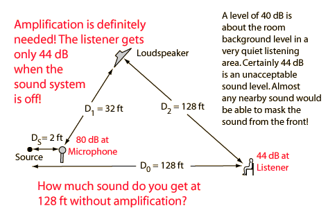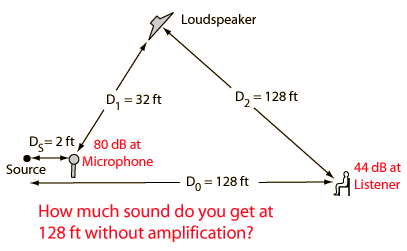 Maximum Amplification ConditionWhen the feedback to the microphone is equal to the original sound input level, the gain can no longer be increased without an uncontrolled increase in output, usually in the form of a loud ring at one frequency. Practically, the sound should be kept about 3 dB below that point. If 80 dB is the input level to the microphone, then 80 dB feedback return is an upper bound. Using the inverse square law, the resulting levels are as shown. ![]()