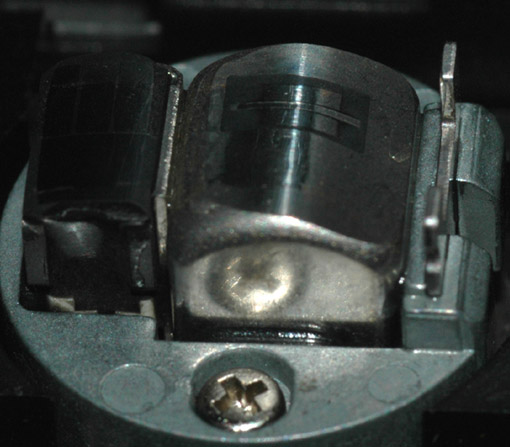 ![]() ![]() This is the head structure in a Kenwood tape deck. The structure to the left of the head may be for erasing. The head is about 7 mm from left to right in the image. |