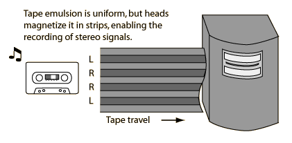 Magnetic EmulsionsThe recording medium for the tape recording process is typically made by embedding tiny magnetic oxide particles in a plastic binder on a polyester film tape. Iron oxide has been the most widely used oxide, leading to the common statement that we record on a "ribbon of rust". But chromium oxide and metal particles provide a better signal-to-noise ratio and a wider dynamic range. The oxide particles are on the order of 0.5 micrometers in size and the polyester tape backing may be as thin as 0.5 mil (.01 mm). The oxide particles themselves do not move during recording. Rather their magnetic domains are reoriented by the magnetic field from the tape head. ![]() Tape heads for stereo cassette tapes must record on two tracks simultaneously.