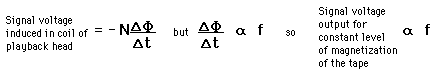 Equalization for Tape PlaybackWhen a magnetic image of a sound signal is recorded onto tape with optimum bias, the magnetization of the tape is linearly proportional to the signal voltage applied to the head. The playback process, depends not only upon the magnetization of the tape which passes under the playback head but also upon its frequency. By Faraday's law: ![]() The output signal voltage then increases by a factor of two for each octave rise in frequency f, so an equalization circuit must be employed to reduce the signal back to proper balance. A factor of two in voltage is 6 decibels in power, so the equalization circuit must increase its attenuation 6 dB per octave. |