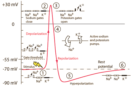 In response to the appropriate stimulus, the cell membrane of a nerve cell goes through a sequence of depolarization from its rest state followed by repolarization to that rest state. In the sequence, it actually reverses its normal polarity for a brief period before reestablishing the rest potential.