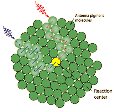 Antenna Complexes for PhotosynthesisThe capture of light energy for photosynthesis is enhanced by networks of pigments in the chloroplasts arranged in aggregates on the thylakoids. These aggregates are called antennae complexes. Evidence for this kind of picture came from research by Robert Emerson and William Arnold in 1932 when they measured the oxygen released in response to extremely bright flashes of light. They found that some 2500 molecules of chlorophyll was required to produce one molecule of oxygen, and that a minimum of eight photons of light must be absorbed in the process.