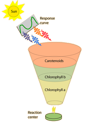 When a photon reaches the chlorophyll a in the reaction center, that chlorophyll can receive the energy because it absorbs photons of longer wavelengths than the other pigments. Two types of chlorophyll centers have been identified, and are associated with two protein complexes identified as Photosystem I and Photosystem II.