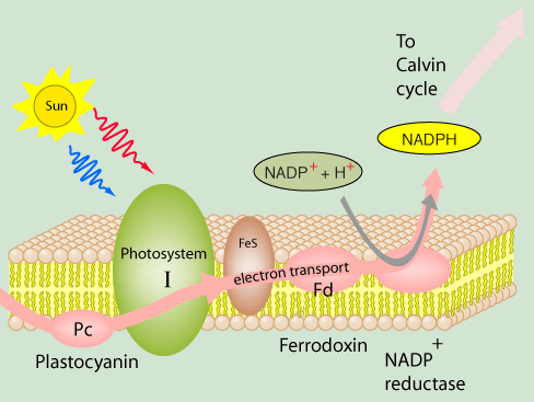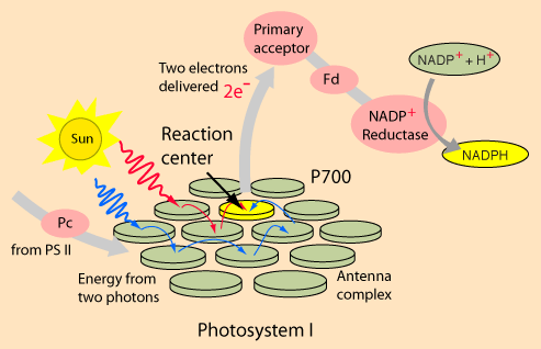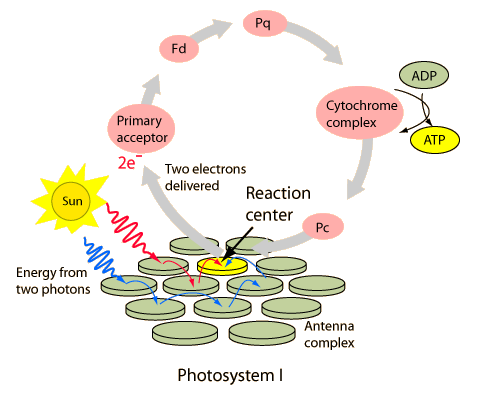 Photosystem IThe light absorption processes associated with photosynthesis take place in large protein complexes known as photosystems. The one known as Photosystem I contains a chlorophyll dimer with an absorption peak at 700 nm known as P700. ![]() Photosystem I makes use of an antenna complex to collect light energy for the second stage of non-cyclic electron transport. It collects energetic electrons from the first stage process which is powered through Photosystem II and uses the light energy to further boost the energy of the electrons toward accomplishing the final goal of providing energy in the form of reduced coenzymes to the Calvin cycle. ![]() The above sketch depicts the setting of Photosystem I in the electron transport process which provides energy resources for the Calvin cycle. ![]() Photosystem I is the light energy complex for the cyclic electron transport process used in some photosynthetic prokaryotes. The protein complex that constitutes Photosystem I contains eleven polypeptides, six of which are coded in the nucleus and five are coded in the chloroplast. The core of Photosystem I contains about 40 molecules of chlorophyll a, several molecules of beta carotene, lipids, four manganese, one iron, several calcium, several chlorine, two molecules of plastoquinone, and two molecules of pheophytin, a colorless form of chlorophyll a .(Moore, et al.)