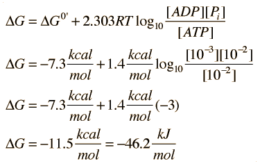 Free Energy from Hydrolysis of ATPAdenosine triphosphate (ATP) is the energy currency of life and it provides that energy for most biological processes by being converted to ADP (adenosine diphosphate). Since the basic reaction involves a water molecule, this reaction is commonly referred to as the hydrolysis of ATP. The change in Gibbs free energy in the reaction is used to assess the energy yield of such reactions, and as a general indicator of the spontaneity of reactions. Under standard conditions this change ΔG0' is .But inside a living cell, typical concentrations of the reactants might be [ATP]=10mM, [ADP]=1mM and [Pi]=10mM. Under those conditions the free energy change is .Because of the concentrations of ATP and ADP in the cell, the conditions are very favorable for the use of the hydrolysis of ATP as an energy source. In fact, many processes with positive ΔG values can take place when coupled with the hydrolysis of ATP.