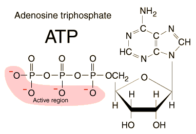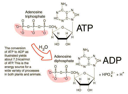 Conversion from ATP to ADPAdenosine triphosphate (ATP) is the energy currency of life and it provides that energy for most biological processes by being converted to ADP (adenosine diphosphate). Since the basic reaction involves a water molecule, this reaction is commonly referred to as the hydrolysis of ATP. ![]() The structure of ATP has an ordered carbon compound as a backbone, but the part that is really critical is the phosphorous part - the triphosphate. Three phosphorous groups are connected by oxygens to each other, and there are also side oxygens connected to the phosphorous atoms. Under the normal conditions in the body, each of these oxygens has a negative charge, and as you know, electrons want to be with protons - the negative charges repel each other. These bunched up negative charges want to escape - to get away from each other, so there is a lot of potential energy here. If you remove just one of these phosphate groups from the end, so that there are just two phosphate groups, the molecule is much happier. If you cut this bond, the energy is sufficient to liberate about 7000 calories per mole, about the same as the energy in a single peanut. Living things can use ATP like a battery. The ATP can power needed reactions by losing one of its phosphorous groups to form ADP, but you can use food energy in the mitochondria to convert the ADP back to ATP so that the energy is again available to do needed work. In plants, sunlight energy can be used to convert the less active compound back to the highly energetic form. For animals, you use the energy from your high energy storage molecules to do what you need to do to keep yourself alive, and then you "recharge" them to put them back in the high energy state.