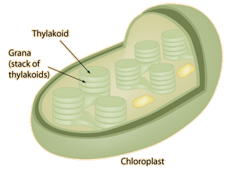 The stacks of thylakoids are called grana. They are connected with an extensive sytem of tubules. The thylakoid membranes contain chlorophyll and other pigments arranged in antenna arrays to capture light energy for two photosystems called Photosystem I and Photosystem II. In most plants, both photosystems are used in an electron transport process that yields energy in the form of ATP and reduced coenzymes to the stroma of the chloroplast to be used in the synthesis of carbohydrates. The energy is used in the Calvin cycle to fix carbon from atmospheric CO2 and construct sugars. Order can be produced with an expenditure of energy, and the order associated with life on the earth is produced with the aid of energy from the sun. ![]()