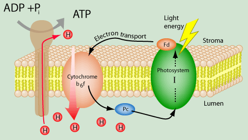 Cyclic Electron Transport in PhotosynthesisPhotophosphorylation refers to the use of light energy to ultimately provide the energy to convert ADP to ATP, thus replenishing the universal energy currency in living things. In the simplest systems in prokaryotes, photosynthesis is used just for the production of energy, and not for the building of any biological molecules. In these systems there is a process called cyclic photophosphorylation, which just accomplishes the ADP to ATP process for immediate energy for these cells. This process uses only Photosystem I and the chlorophyll P700. ![]() The above sketch of the cyclic process is patterned after a visualization in Moore, et al. Two photons from either the red or blue end of the spectrum fit the sensitive response of the pigments. They are captured by the antenna complex and transferred to the Photosystem I reaction center, which contributes two high energy electrons to the primary electron receptor. They are passed to ferrodoxin (Fd), an iron containing protein which acts as an electron carrier. A second electron carrier plastoquinone (Pq) carries the electrons to a complex of two cytochromes. In the process, energy is provided to produce a proton gradient across the membrane which can be used for the ADP to ATP conversion. The electrons are returned by plastocyanin (Pc) to the P700 pigment in the reaction center to complete the cycle. ![]() This sketch follows the lead of Karp to place the events relative to the membrane. This makes it clearer that the process of producing the ATP is driven by the proton gradient. Karp points out that this cyclic photophosphorylation also takes place in isolated chloroplasts and can provide additional ATP to aid the carbohydrate synthesis taking place as result of the non-cyclic electron transport.