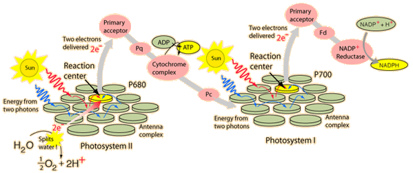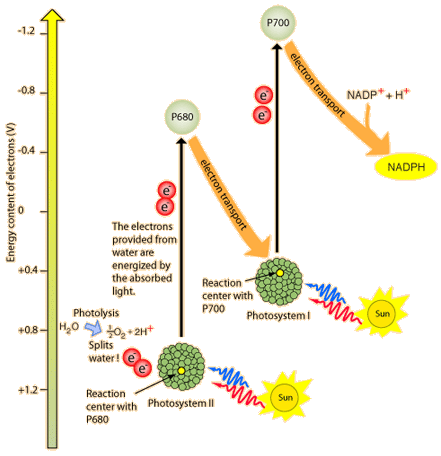 Non-cyclic Electron Transport in Photosynthesis![]() Photophosphorylation refers to the use of light energy to ultimately provide the energy to convert ADP to ATP, thus replenishing the universal energy currency in living things. In the simplest systems in prokaryotes, photosynthesis is used just for the production of energy, and not for the building of any biological molecules. But in plants the photosynthesis process also provides energy in the form of reduced coenzymes which drive the process of biochemical synthesis culminating in the production of glucose and other sugars. This process uses both Photosystem II and Photosystem I acting in series. The above illustration is patterned after Moore and shows some of the steps of the non-cyclic electron transport process.
