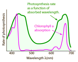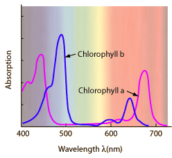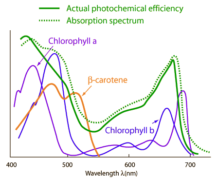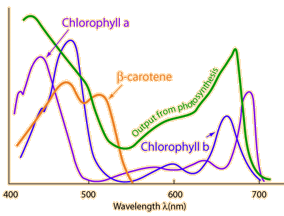 ![]() The plot of the absorption spectra of the chlorophylls plus beta carotene correlates well with the observed photosynthetic output. The measure of photochemical efficiency is made by meauring the amount of oxygen produced by leaves following exposure to various wavelengths. It is evident from these absorption and output plots that only the red and blue ends of the visible part of the electromagnetic spectrum are used by plants in photosynthesis. The reflection and transmission of the middle of the spectrum gives the leaves their green visual color.